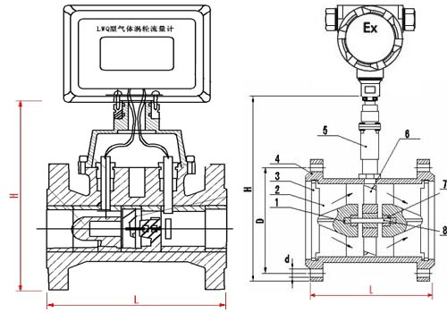 當流體流入氣體渦輪流量計時,在進氣口專用一體化整流器的作用下整流并加速,由于渦輪葉片與流體流向成一定角度,此時渦輪產生轉動力矩,在克服摩擦力矩和流體阻力矩后,渦輪開始旋轉。在一定的流量范圍內,渦輪旋轉的角速度與流體體積流量成正比。根據電磁感應原理,利用磁敏傳感器從同軸轉動的信號輪上感應出與流體體積流量成正比的脈沖信號,該信號經放大、濾波、整形后與溫度、壓力傳感器信號一起進入氣體渦輪流量計表頭的微處理單元進行運算處理,并把氣體的體積瞬時流量和累積流量計直接顯示于LCD屏上。