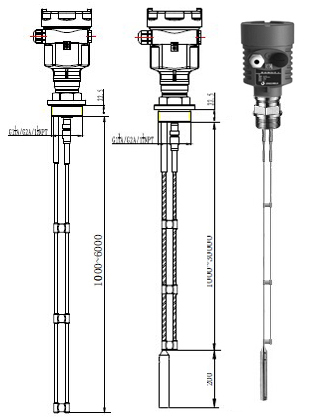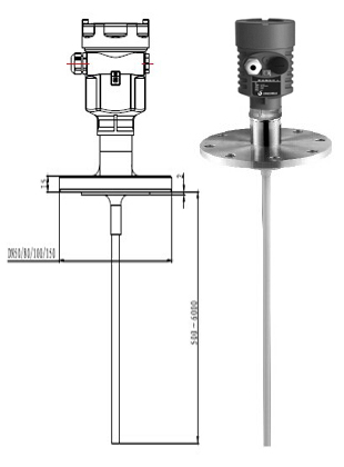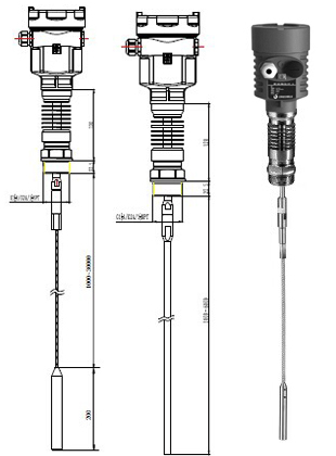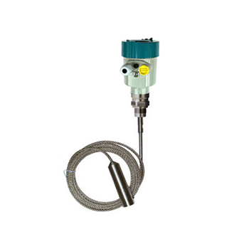 導(dǎo)波雷達(dá)物位計(jì)發(fā)出的高頻微波脈沖沿著探測(cè)組件(鋼纜或鋼棒)傳播,遇到被測(cè)介質(zhì),由于介電常數(shù)突變,引起反射,一部分脈沖能量被反射回來(lái)。發(fā)射脈沖與反射脈沖的時(shí)間間隔與被測(cè)介質(zhì)的距離成正比。從而計(jì)算出探測(cè)組件頂部被測(cè)介質(zhì)表面的距離,被測(cè)容器總高度是已知數(shù),進(jìn)一步可得出介質(zhì)的物位高度。