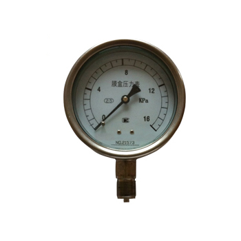 不銹鋼膜盒壓力表由測量系統(包括接頭,波紋膜盒等),傳動機構(包括拔桿機構,齒輪傳動機構),指示部件(包括指針與度盤)和外殼(包括表殼、襯圈和表玻璃)所組成。