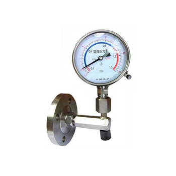 特殊法蘭隔膜壓力表由各種通用型壓力儀表和不同結構的隔膜隔離器組成一個封閉系統,內充密封液。當被測介質的壓力作用于隔膜時,則隔膜產生變形,壓縮封閉系統中的密封液。由于密封液的固有性質,使壓力儀表中的彈性元件產生相應的彈性變形—位移,經指示裝置顯示壓力值。當隔膜的剛度足夠小時,則壓力儀表指示的壓力就近于被測介質的壓力值。